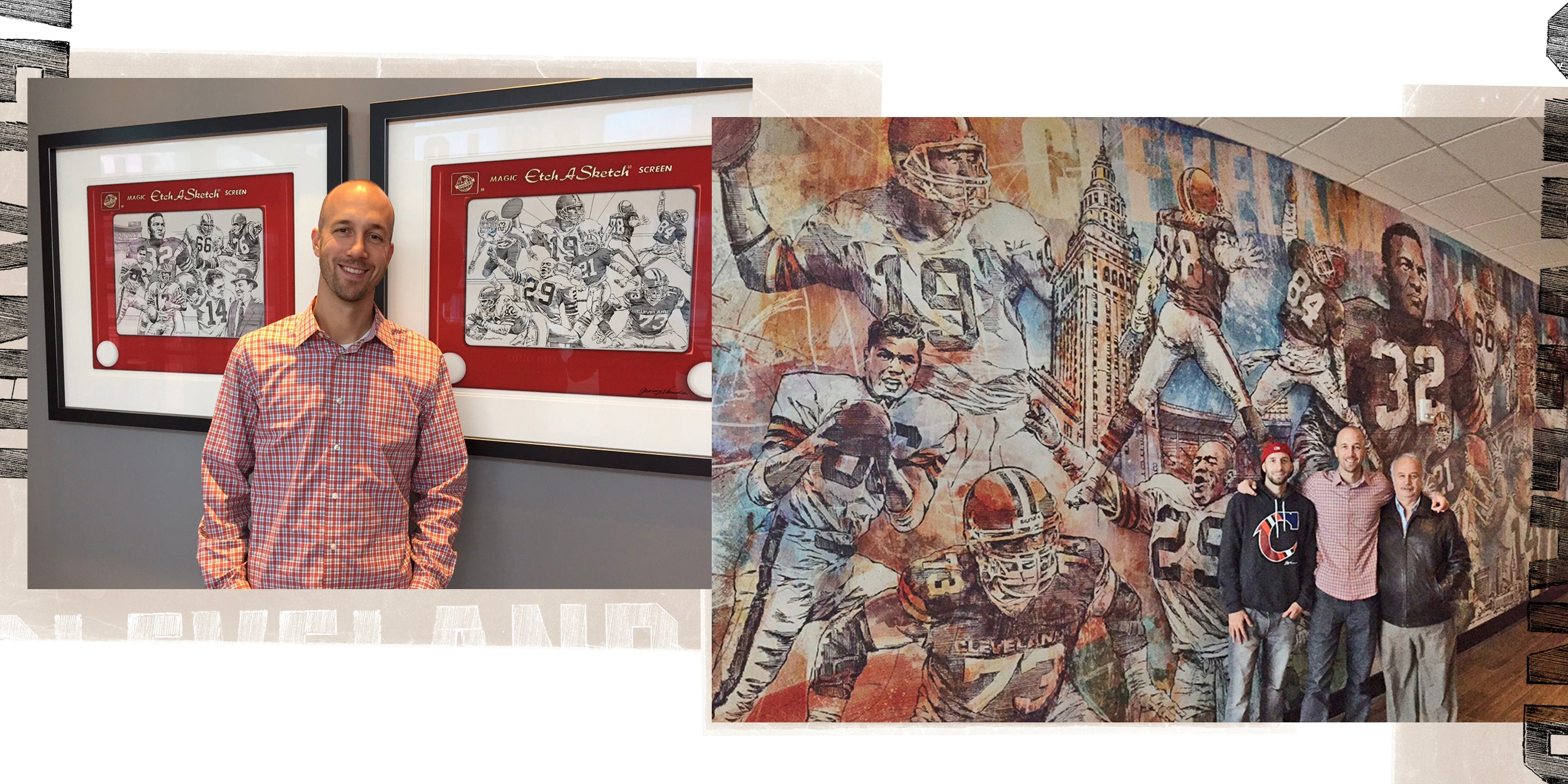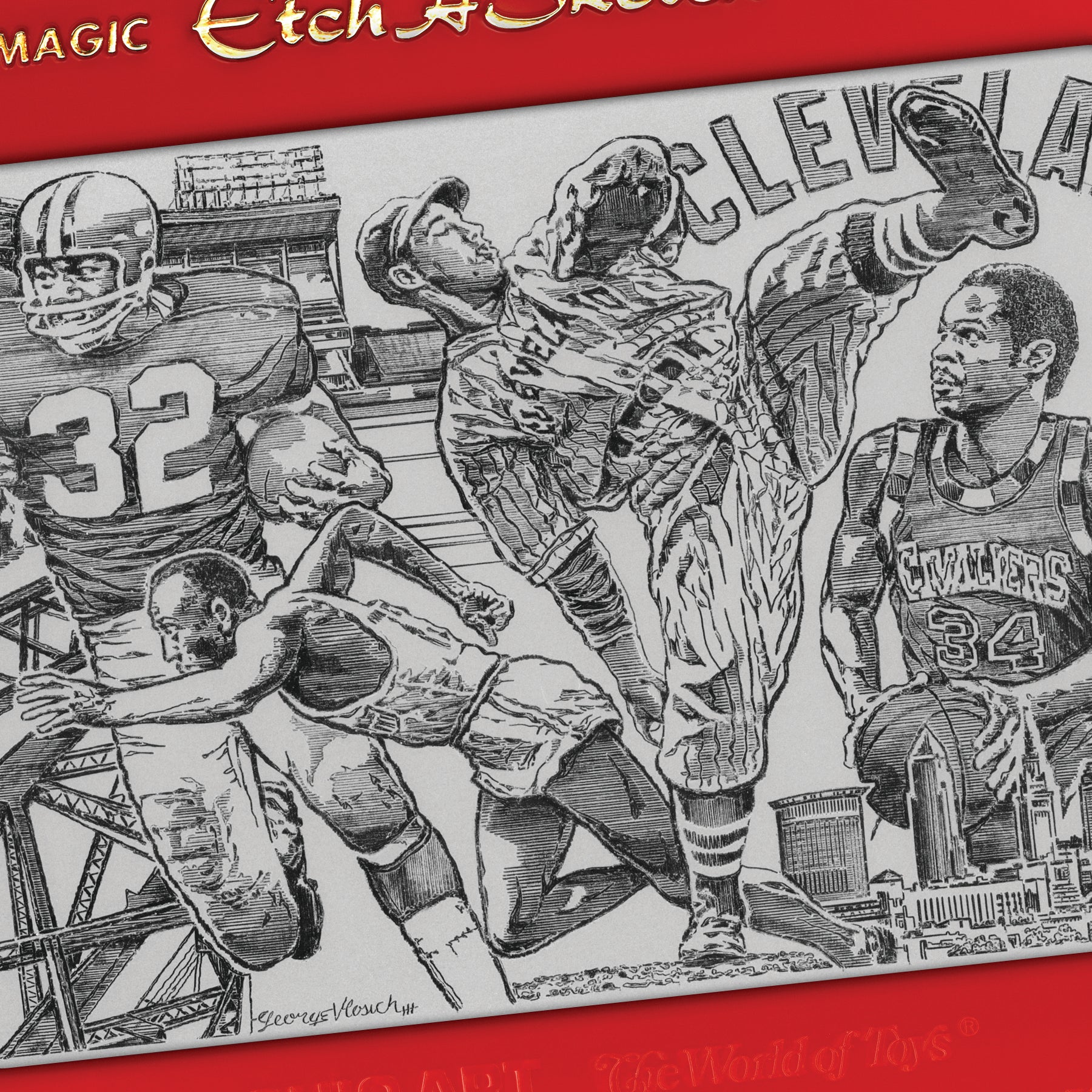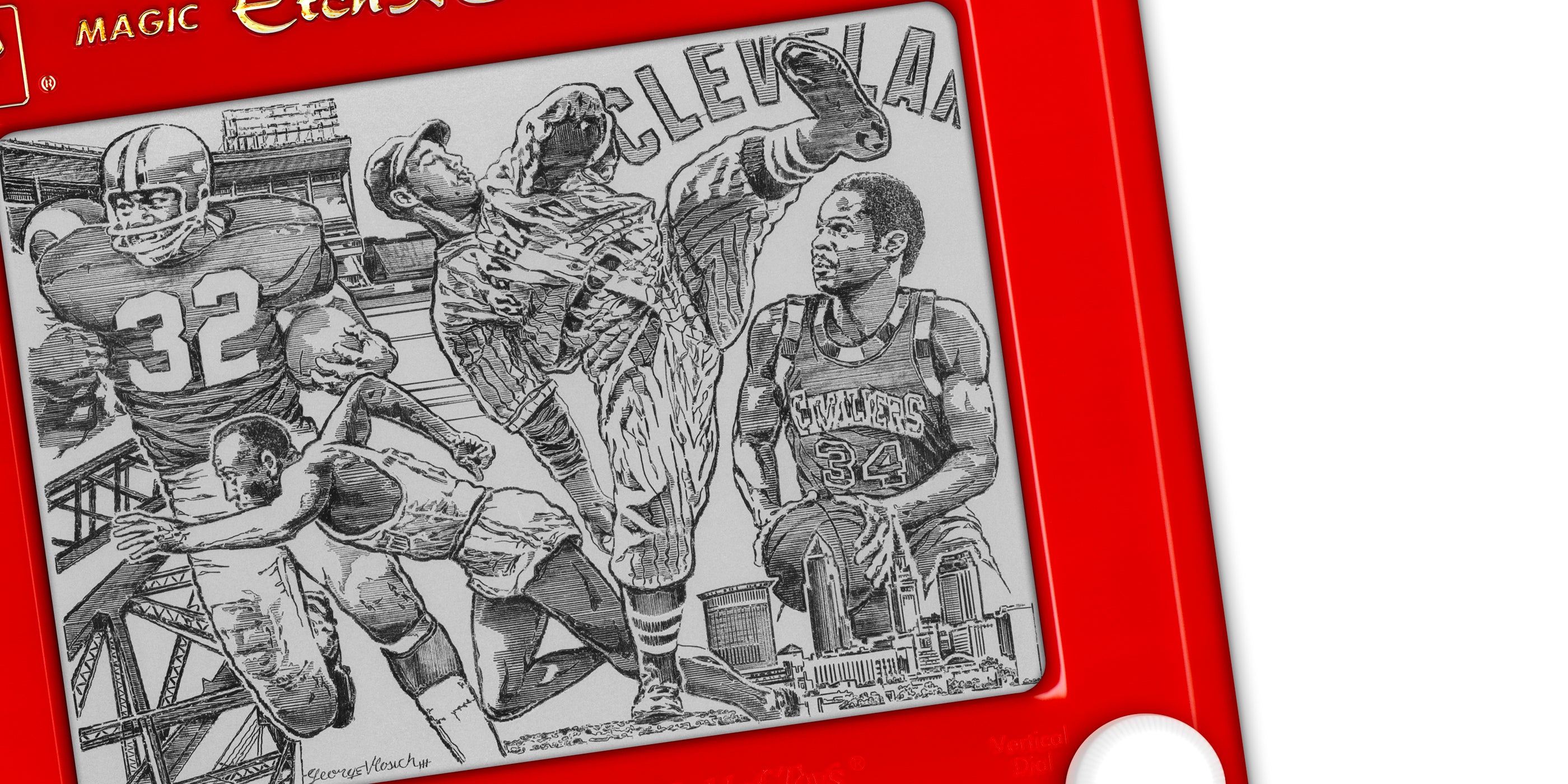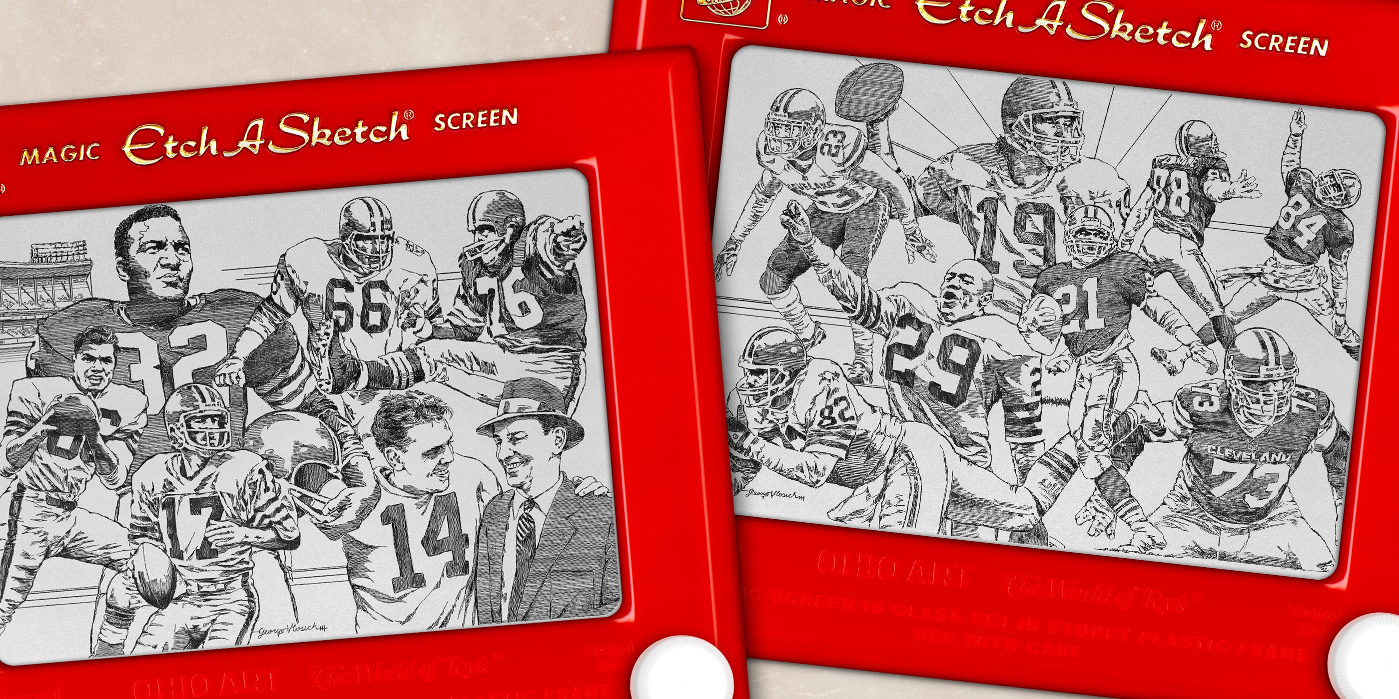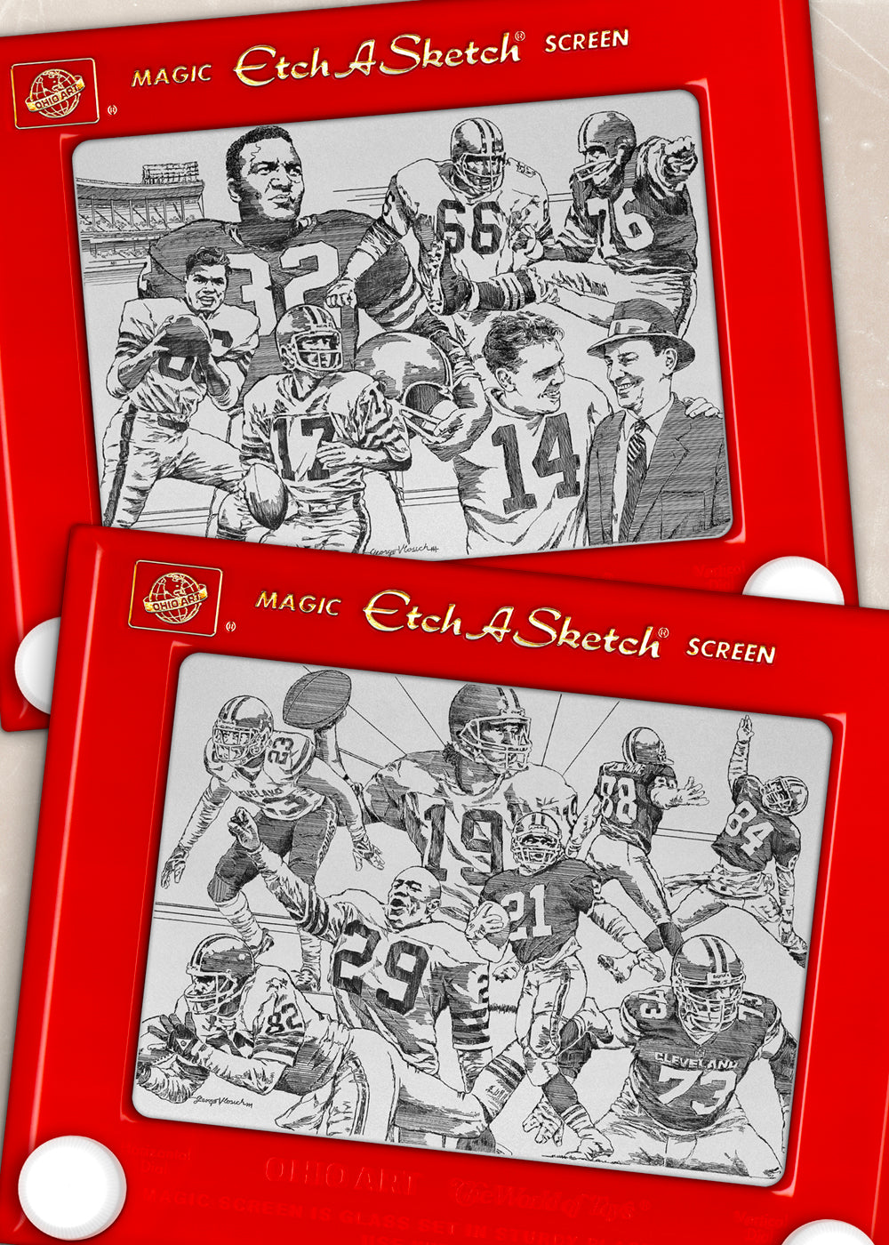 George was commissioned to create two original Etch A Sketches and a 40-foot mural of 15 of the top players in Cleveland Browns history for their new renovations at First Energy Stadium. Using the Etch allows George to design unique pieces that have mass appeal and create artwork and apparel that no one else in the world can create. It is truly one-of-a-kind.