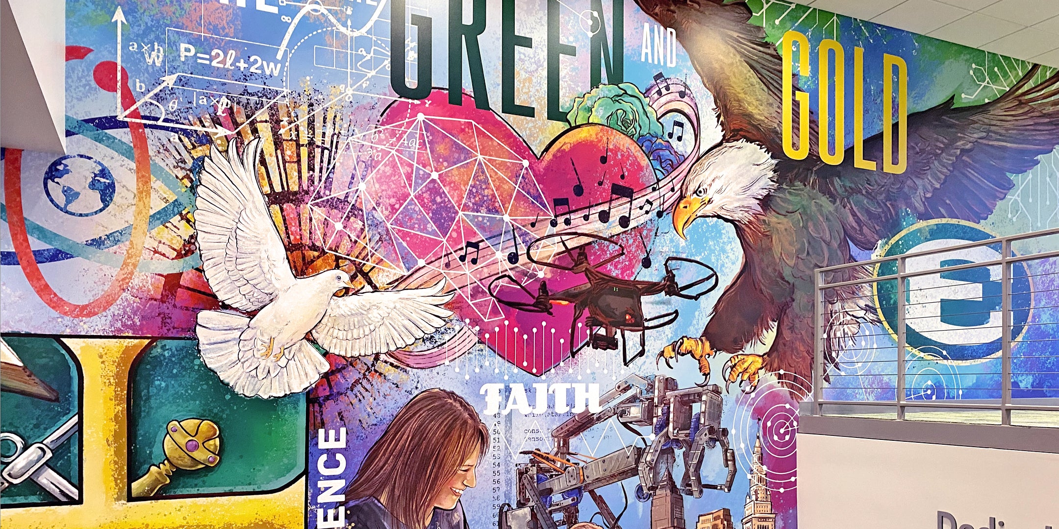 George was asked to create a mural for st. Edward high school’s new 15,000 square-foot expansion. The centerpiece of the new commons is an 18 foot mural by George that depicts the history of the holy cross and St. Edward High School. The mural highlights the important elements of the school as well as their commitment to developing the hearts and minds of their students.