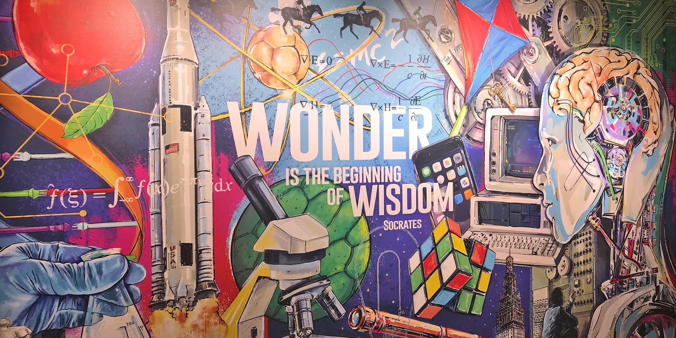 George was asked to create two murals that represent the right and left brain that leads you into the new innovation center at St. Edward High School. George wanted to incorporate fun ways to show both the creative side and analytical side of the human brain. Each time you look at it, George wanted there to be fun and new things to find and be a learning tool of things to discover as you walk into the classrooms there.