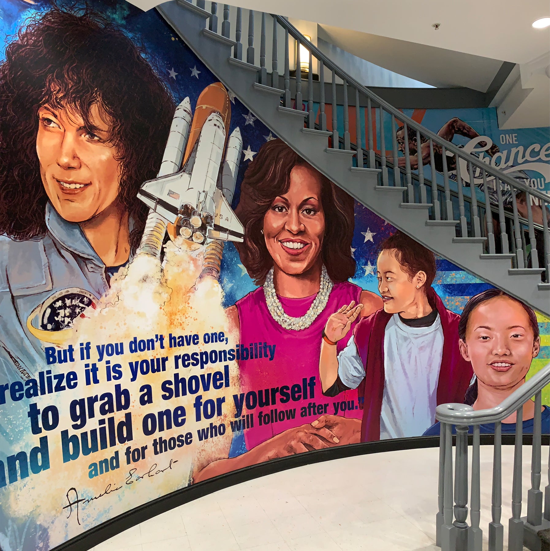 George was asked to create a mural that could serve as an inspiration for students. It has become a focal point for the school and backdrop for media appearances. The first mural showcases Lebron and iconic and historic figures that have influenced his life. The mural was such a hit, they asked George to create a second mural featuring prominent and inspirational women to the school.